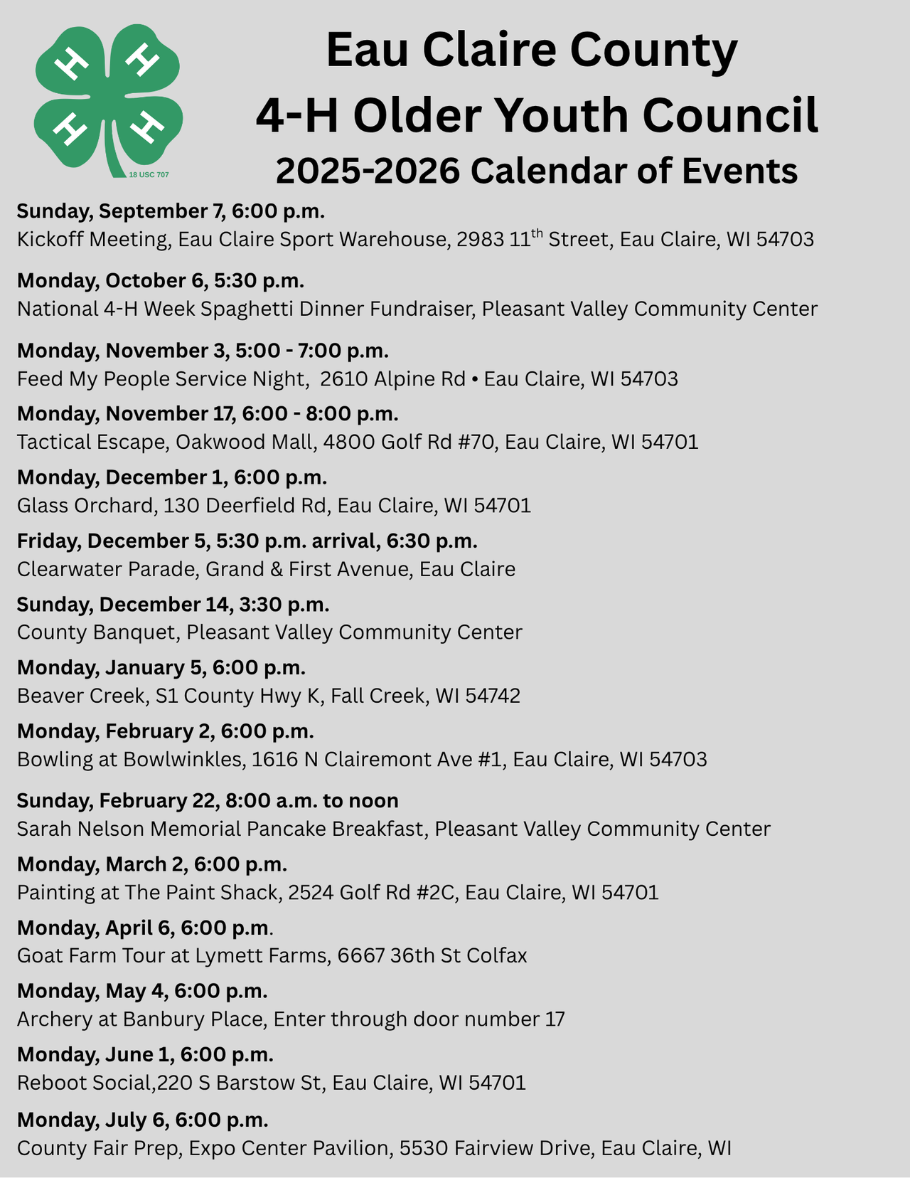 Any 4-H member 8th grade until one year past high school, and enrolled in the Youth Leadership Project are eligible for membership.